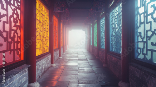 Fototapeta premium A mysterious foggy street illuminated by a soft light, narrow alleyway lined with traditional East Asian architecture, A gentle mist adds a mystical ambiance, enhancing the atmosphere of the scene.