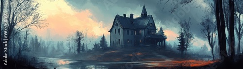 Fototapeta premium A mysterious haunted house silhouette surrounded by foggy trees and a tranquil lake, evoking a sense of eerie tranquility.