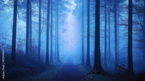 Fototapeta premium A mysterious path through a foggy blue forest.
