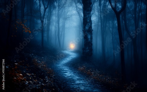 Naklejka premium A mysterious path winds through a dense, fog-filled forest at dusk, leading...