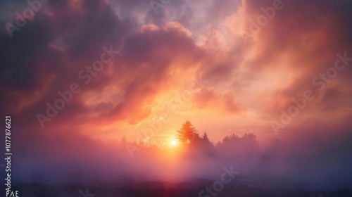 © Santy Hong, Fototapeta premium A mysterious sunset with soft light piercing through a foggy sky, creating a dreamlike and serene atmosphere.