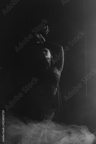 © Христя Сидор, Fototapeta premium A mysterious woman stands in silhouette against a bright window, surrounded by dramatic smoke and shadows