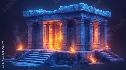 © BloomArt, Obraz premium A mystical ancient temple with glowing entrance, set against a dark background.