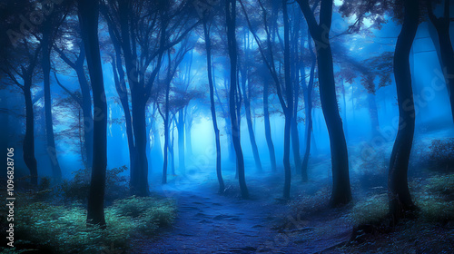 Obraz premium A mystical and ethereal forest shrouded in blue mist, revealing ancient trees...
