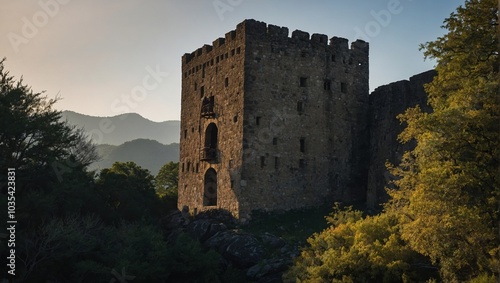 Fototapeta premium A mystical archer tower shrouded in fog adds to its allure