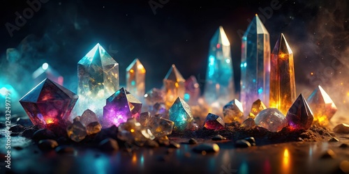 Obraz premium A Mystical Collection of Iridescent Crystals Glowing with Inner Light in a...