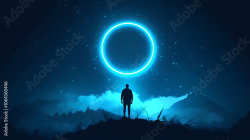 Fototapeta premium A mystical concept of a man standing on a hill with a glowing neon circle...