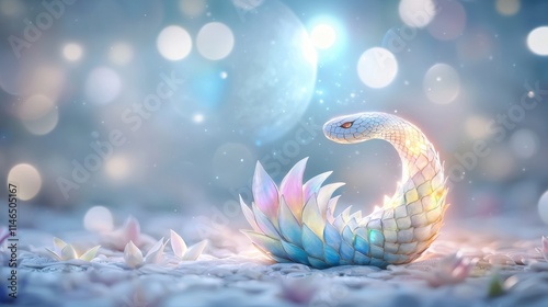 © Navaporn, Obraz premium A mystical creature with pastel-colored scales rests on a soft surface, surrounded by a dreamy atmosphere filled with sparkling lights.