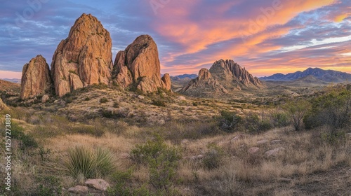 © Artittaya, Fototapeta premium A mystical desert with towering rock formations glowing at sunrise