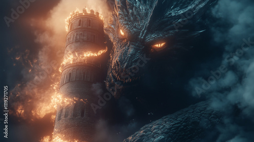 © Kristina, Fototapeta premium A mystical dragon coiled around an ancient tower, with glowing eyes and smoke emanating from its nostrils
