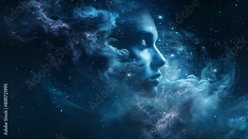 © saichon, Fototapeta premium A mystical emergence, woman's visage amidst a swirl of cosmic dust on navy backdrop