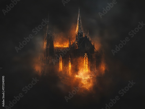 Fototapeta premium A mystical floating temple carved from glowing crystal, suspended above an endless sea of mist. Radiant beams of light emanate from the temple’s spires, illuminating floating staircases that