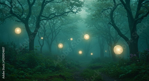 © Kenny, Fototapeta premium A mystical forest illuminated by floating orbs of light in the mist (안개 속에서 떠다니는 빛의 구체로 밝혀진 신비로운 숲)