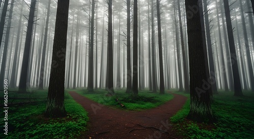 Fototapeta premium A Mystical Forest Path Disappearing Into Dense Fog Creating an Ethereal...