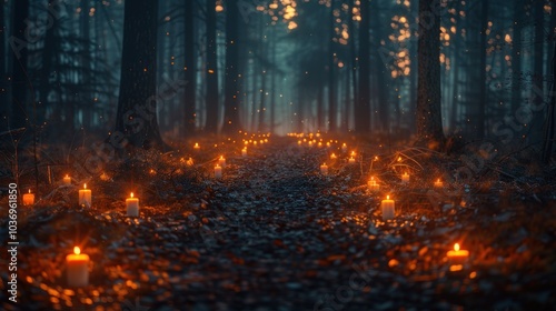 Naklejka premium A mystical forest path illuminated by flickering candles on a serene evening...