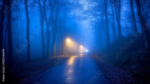 © IMAGINIAC, Obraz premium A Mystical Forest Path Lit by Streetlights in the Fog
