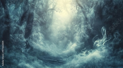 © Rere_Art151, Obraz premium A Mystical Forest Path shrouded in Fog and Sunlight