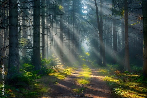 Fototapeta premium A mystical forest path with light rays filtering through the trees