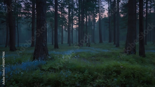 Fototapeta premium A Mystical Forest Pathway at Dusk with Blue Flowers