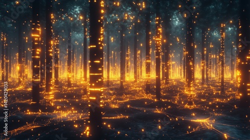 Naklejka premium A mystical forest scene illuminated by glowing orange lights, creating a magical atmosphere. Tall trees stand amidst a shimmering ground, evoking a sense of wonder and fantasy.
