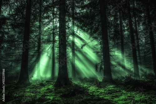 Fototapeta premium A mystical forest scene with green light beams piercing through tall trees,...