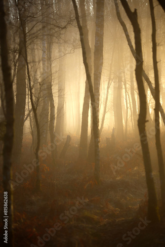 Fototapeta premium A mystical forest scene with sunlight piercing through the fog, illuminating...