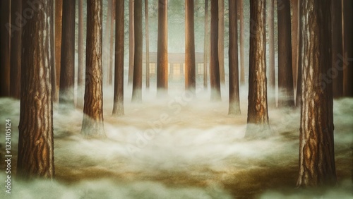 Naklejka premium A mystical forest scene with tall trees shrouded in fog, creating an ethereal...