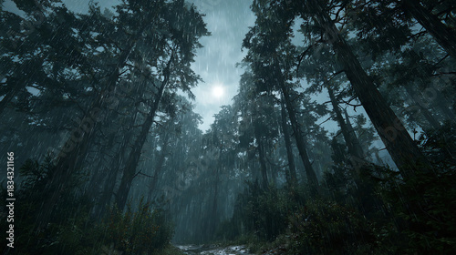 © Thiago, Fototapeta premium A mystical forest shrouded in atmospheric mist, the sun barely visible through the canopy