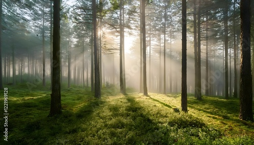© Desmon, Obraz premium A mystical forest shrouded in soft morning fog, with sunlight streaming.
