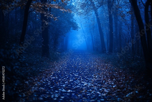 Naklejka premium A mystical forest with a pathway ahead, characterized by its beauty, fog, and...