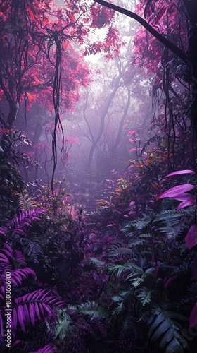 Fototapeta premium A mystical forest with vibrant purple foliage and mist, creating an...