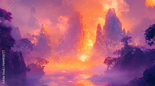 Fototapeta premium A mystical, glowing landscape of towering peaks and lush vegetation.