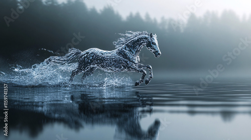 Obraz premium A mystical horse made of water galloping through a calm lake, its body...