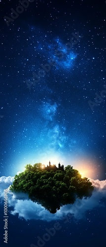 Fototapeta premium A mystical island floats amidst a starry sky, illuminated by a soft glow, blending nature and celestial beauty.