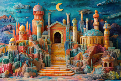 © Dzmitry, Fototapeta premium A mystical landscape of colorful architecture celebrating Hanukkah at night