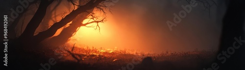 Obraz premium A mystical landscape shrouded in fog, with an ethereal glow illuminating the trees and underbrush, creating a haunting atmosphere.