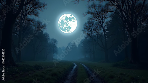 Fototapeta premium A mystical moon illuminates a serene forest path, casting shadows on the...