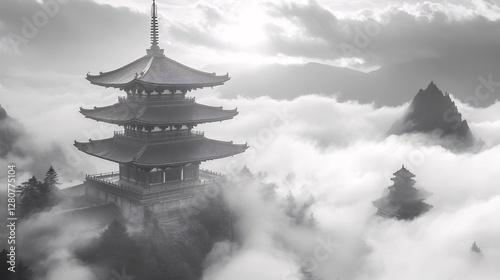 Fototapeta premium A mystical mountain temple floating above stormy clouds