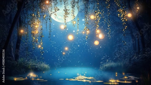 Obraz premium A mystical night forest with shimmering vines and glowing moonlit ponds