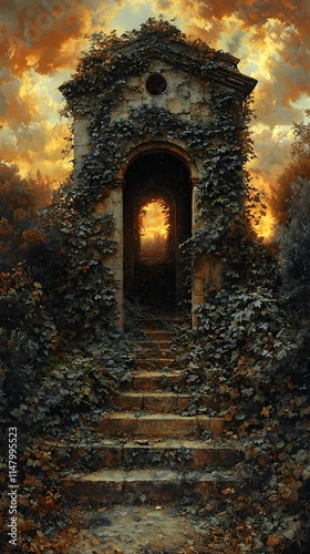 Fototapeta premium A mystical path leads through an ancient stone archway, enveloped in vibrant greenery and illuminated by a golden sunset, evoking a sense of mystery and enchantment.