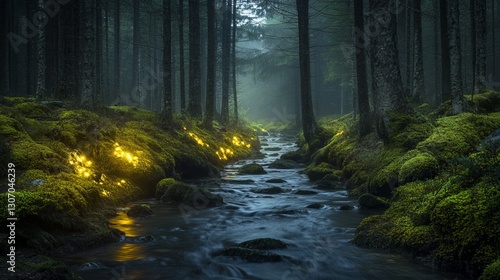 Fototapeta premium A mystical river running through an ancient forest, glowing moss on trees