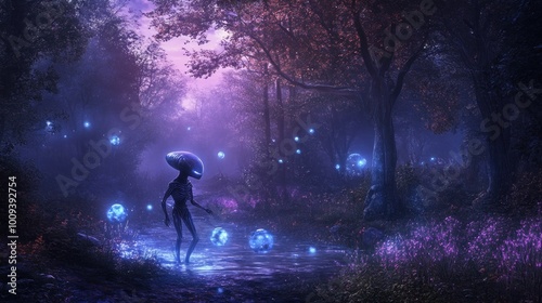 Fototapeta premium A mystical scene featuring an alien figure in a glowing forest with ethereal lights.
