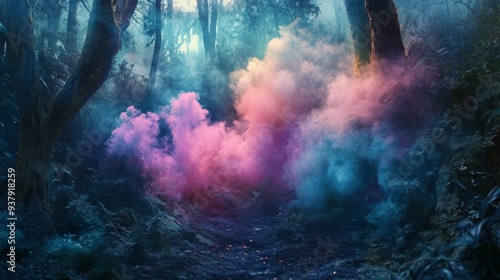 Obraz premium A mystical scene of colored smoke drifting through a dense forest, creating a...