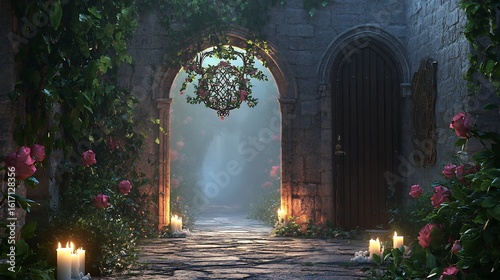 © JubayerHasan, Fototapeta premium A mystical stone corridor features an ornate archway with a reflective mirror surrounded by lush foliage and vibrant pink roses