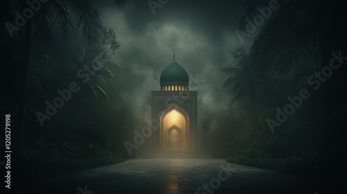 © nadira, Fototapeta premium A mystical structure emerges through misty palms, illuminated in a serene atmosphere.