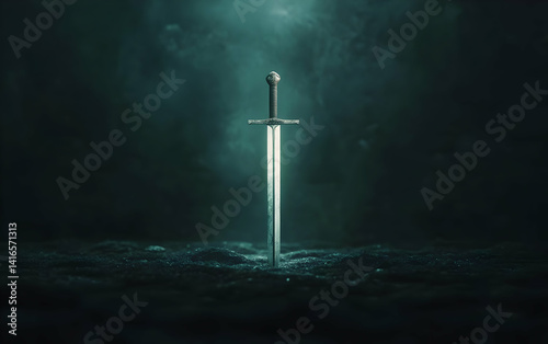 © wannee, Naklejka premium A mystical sword emerges from water, symbolizing strength, valor, and timeless legends in a dramatic light.