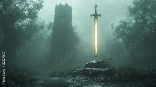 Naklejka premium A mystical sword standing upright surrounded by dense fog near an ancient, crumbling tower, emitting a soft golden glow
