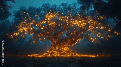 © aritha, Obraz premium A mystical tree illuminated with glowing lights in a serene, foggy environment.