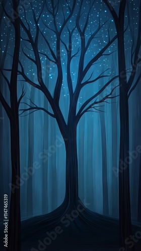 Obraz premium A mystical tree stands tall in a dark, blue-hued forest under a starry night...