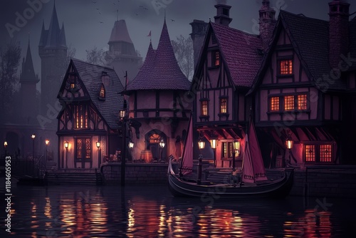 © Umnat, Fototapeta premium A mystical village illuminated by a myriad of lights at night.